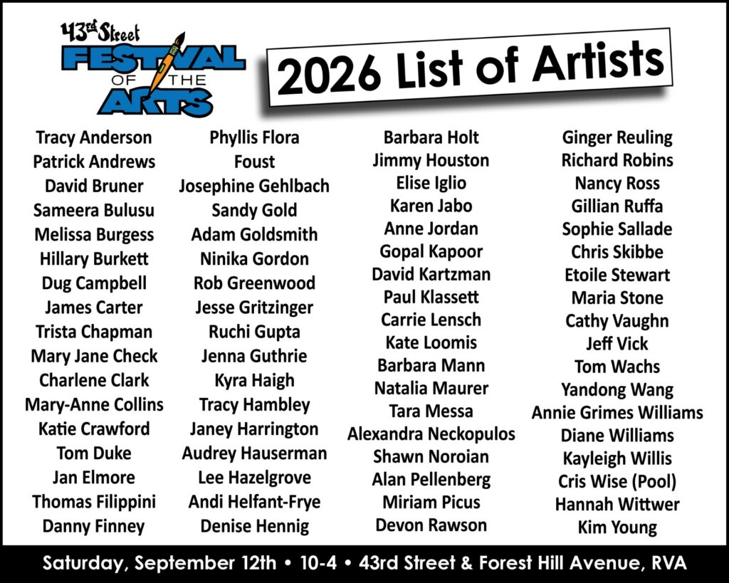Street parking is available around the Forest Hill neighborhood. Food trucks and music will be set up in the parking lot of Good Shepherd Episcopal Church. Allow yourself time to park around the several streets that will be closed for the artists’ booths. Additional parking is available at Forest Hill Park (W 42 St. and New Kent Av.)