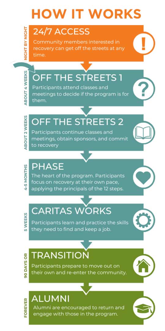 At CARITAS, lasting transformation starts at The Healing Place—our long-term recovery program that lays the foundation for wellness, employment, and stability. This journey continues through a structured path of care, job training, and community support, empowering each participant to heal, grow, and reclaim a life full of purpose.